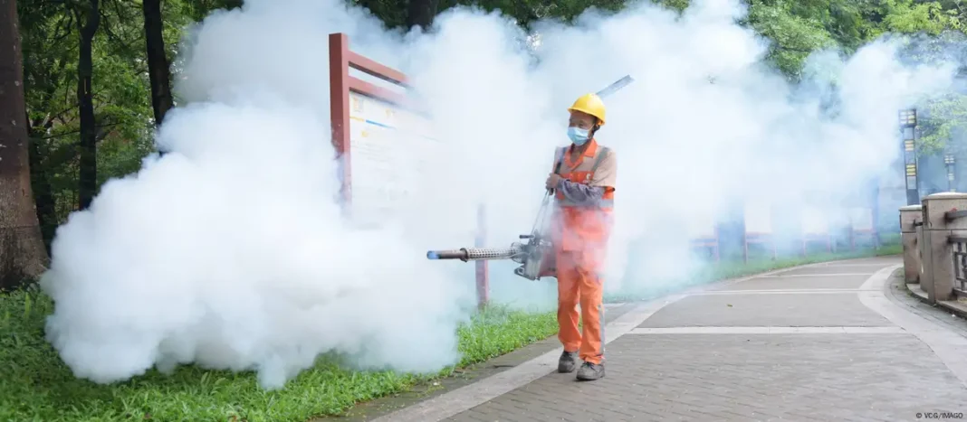 A televisão estatal chinesa mostrou trabalhadores borrifando desinfetante pelas ruas, áreas residenciais, canteiros de obras e outros locais onde pessoas possam entrar em contato com mosquitos infectados, que se reproduzem em focos de água parada.